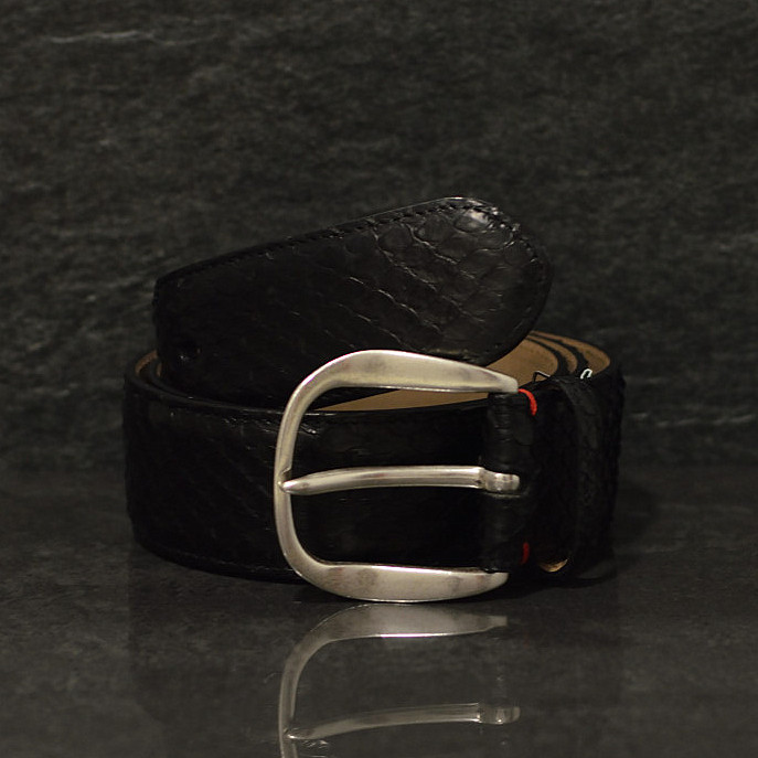 Der handgearbeitete Anakonda-Ledergürtel mit einer Breite von 4,5 cm im eleganten Schwarz und einer Schließe aus Metall veredelt Ihren Look und wird idealerweise auf die Farbe Ihrer Schuhe abgestimmt. Passend zum lässigen und denoch extravagentem Freizeitoutfit.