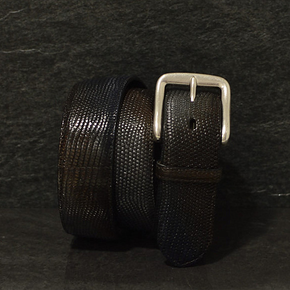 Der noble und handgefertigte Waranledergürtel aus dem Hause Fausto Colato in Mailand ist wie alle Produkte der Firma ein absolutes Unikat, das für moderne Eleganz steht. Der präzise gearbeitete Gürtel sticht mit seiner einmaligen Eleganz ins Auge. Seine klarlinige Dornschließe aus poliertem Metall passt hervorragend zum mehrfarbigen Waranleder.