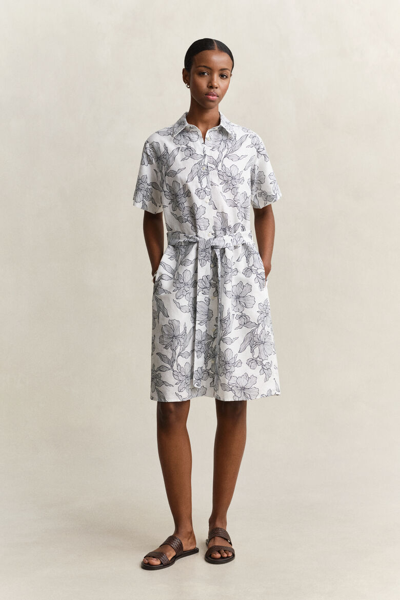 Unser Gant Damen Kleid aus einem Baumwoll-Leinen-Gemisch ist mit einem saisonalen Blumenprint versehen, der in unserem hauseigenen Designstudio entwickelt wurde. Das Modell zeichnet sich durch einen Regular Fit sowie eine elegante Hemden-Silhouette aus und endet knapp oberhalb des Knies. Kurze Ärmel, ein spitzer Kragen, Seitennahttaschen und eine Knopfleiste mit Knöpfen aus recyceltem Polyester vollenden das Design. Es lässt sich mit einem Bindegürtel auf Taille bringen und wird am Rücken von unserer legendären Locker-Loop-Schlaufe mit Gant-Logostickerei geziert.