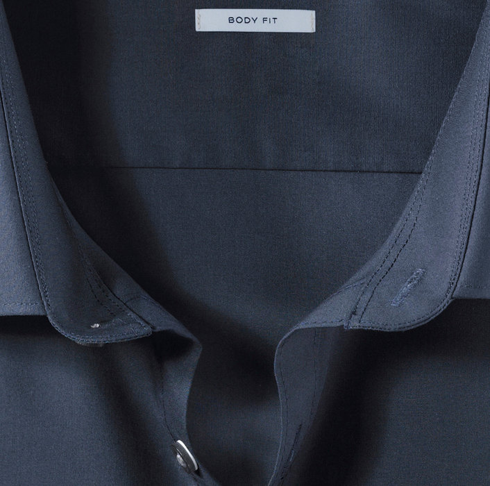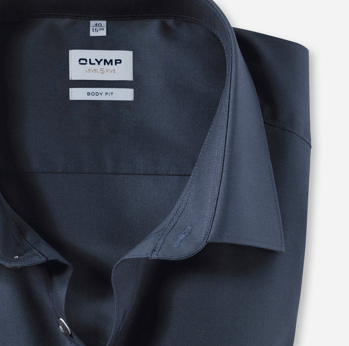 Die junge Hemdlinie OLYMP Level Five überzeugt auf ganzer Linie: körperbetonte Schnittführung, modische Verarbeitung, bügelleichte Eigenschaften. Business-Garderobe auf einem neuen Level. Der Oberstoff aus marinefarbenem Uni in Kombination mit einem eleganten New-York-Kent-Kragen macht dieses Hemd so vielseitig einsetzbar. Das hochwertige Gewebe aus Comfort Stretch bietet ein Höchstmaß an Bewegungsfreiheit – trotz Body-fit-Passform.