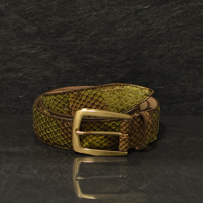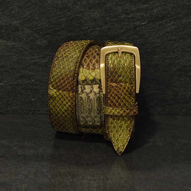 Dieser hochwertige Gürtel aus aus Schlangenleder ist das Modeaccessoire für jeden, der sich schlicht kleiden und trotzdem auffallen will. Der handgefertigte, aus dem Hause Ralph Gladen in Italien stammende Python-Schlangenledergürtel bietet mit einer Breite von 3,5 cm und seinem matten Finsh den perfekten Look. Seine edle Schließe aus in gold rundet das Farbspiel elegant ab.