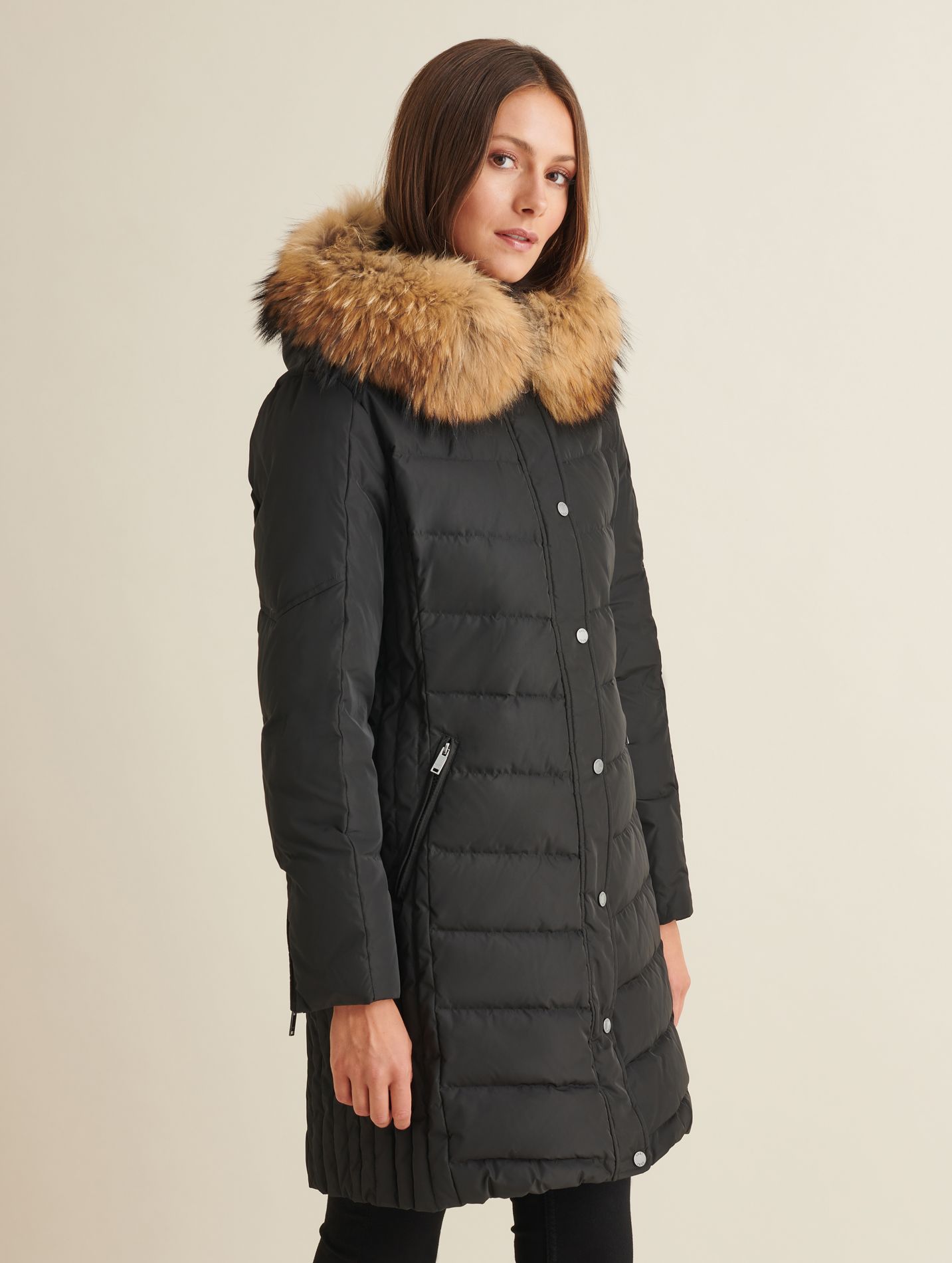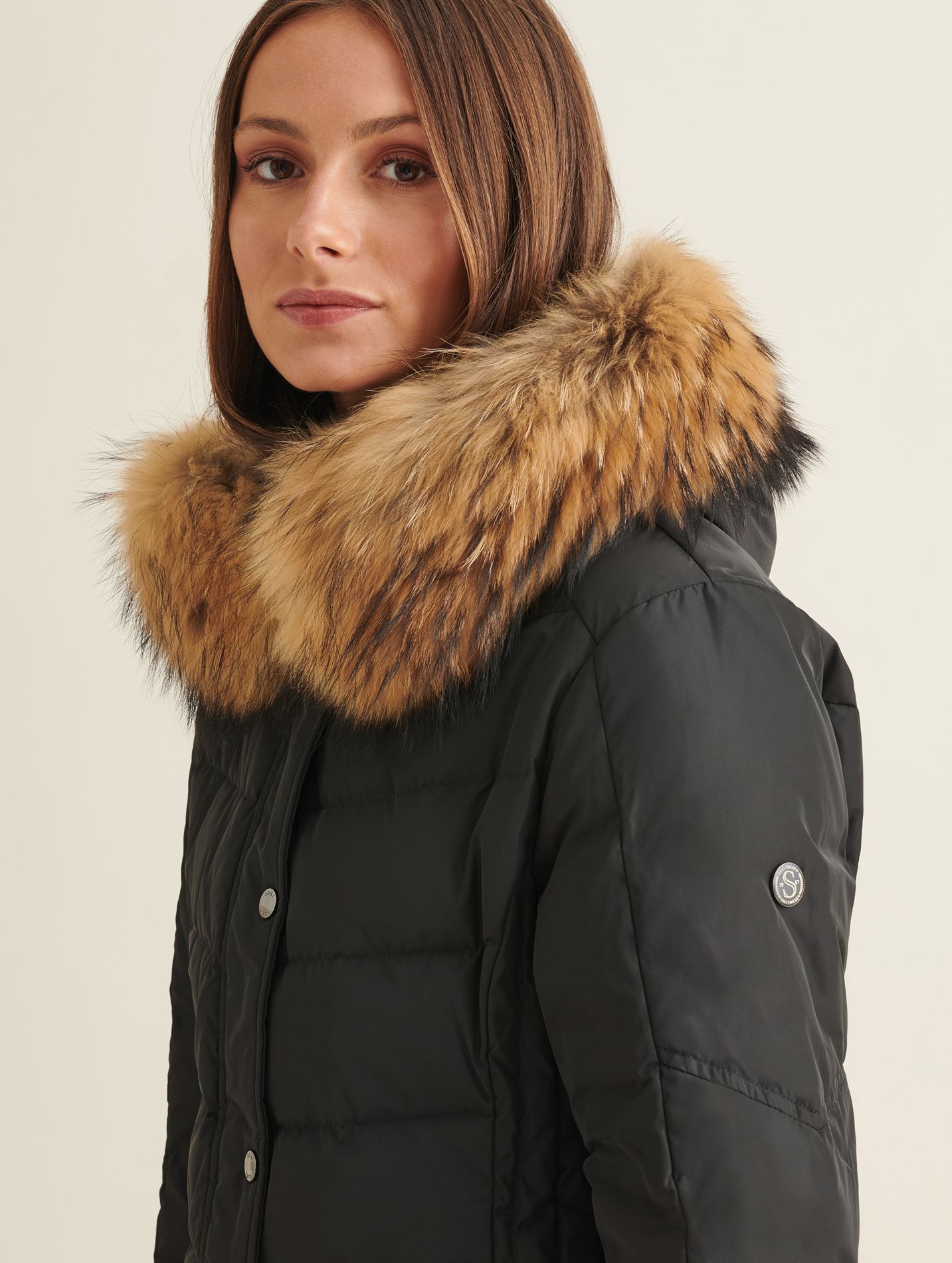 SAKI Sweden Daunenmantel mit Kapuze und Echtfellbesatz in schwarz